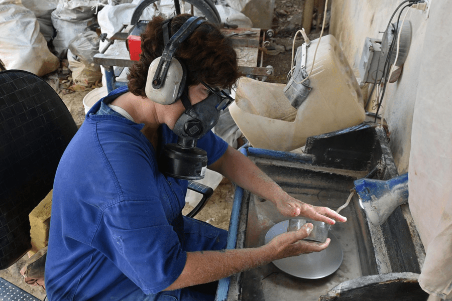 Apunta que, con el propósito de mejorar el proceso manual, su esposo buscó un motor de lavadora de uso, le puso un eje y creó su primera máquina de pulir. Para disminuir el polvo, le conectaron unos inyectores de agua: tubos de suero reciclados que permiten el goteo y así reducen el polvo, que es dañino para la salud.