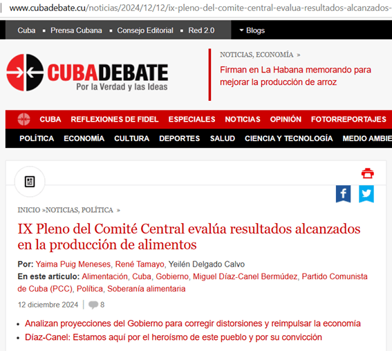 Sobre resultados agropecuarios en 2024, ninguna estadística oficial ha sido informada. La divulgación oficial del pleno partidista indica que se rehúye el aporte de datos para privilegiar lo anecdótico en algunos territorios y en contadas entidades.
