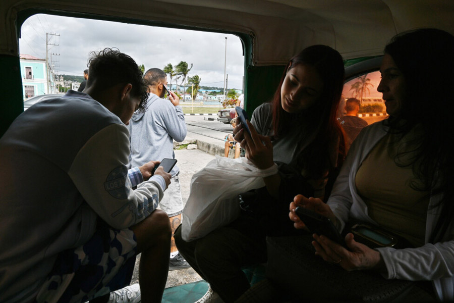 Pasajeros de un taxi privado navegan por internet en sus teléfonos móviles, en la ciudad de Matanzas, Cuba. Al cierre de 2024, existen activas 7,8 millones de líneas móviles en Cuba, de las cuales, 7,1 millones tienen servicio de internet.
