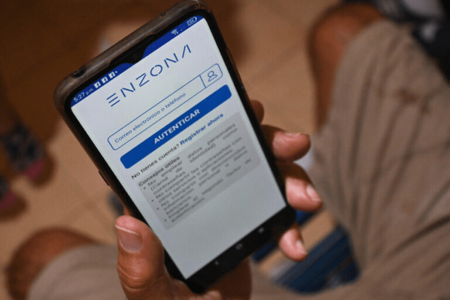 La pantalla de un teléfono móvil muestra la portada de la aplicación En Zona, pasarela de pagos virtuales gestionada por la Empresa de Telecomunicaciones de. El proceso de transformación digital promovido por el gobierno ha causado que el tráfico en internet supere las capacidades de la compañía, lo cual repercute en la calidad del servicio. Imagen: Jorge Luis Baños / IPS