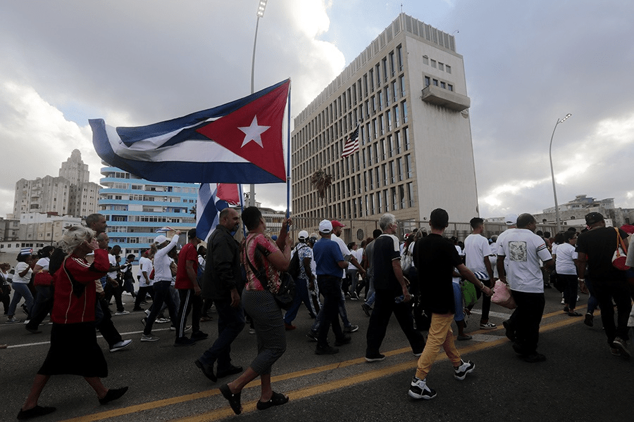 Manifestantes desfilan frente a la sede de la embajada estadounidense, en el malecón de La Habana, durante la marcha convocada el 20 de diciembre en protesta a las sanciones económica de Estados Unidos a Cuba. Según el presidente cubano Miguel Díaz-Canel, esas sanciones resultan un “obstáculo fundamental para el desarrollo, con independencia del esfuerzo que se haga y de las características del modelo económico