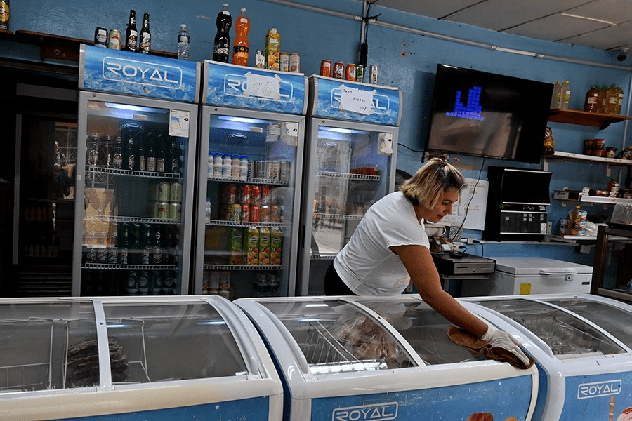 La empleada de un mercado privado en La Habana limpia las neveras del establecimiento mientras aguarda la llegada de clientes. El gobierno proyecta un crecimiento de uno por ciento del PIB para 2025.