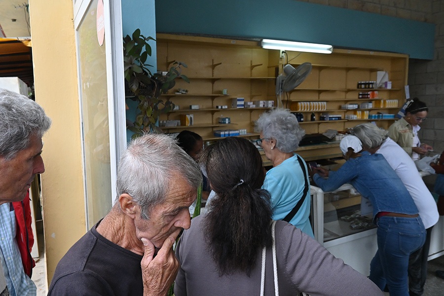 Clientes hacen fila para adquirir medicamentos en una farmacia de La Habana. Al cierre de 2024, faltaba o tenía baja cobertura entre la población, 70 % del cuadro básico de medicamentos en Cuba.Foto: Jorge Luis Baños/IPS