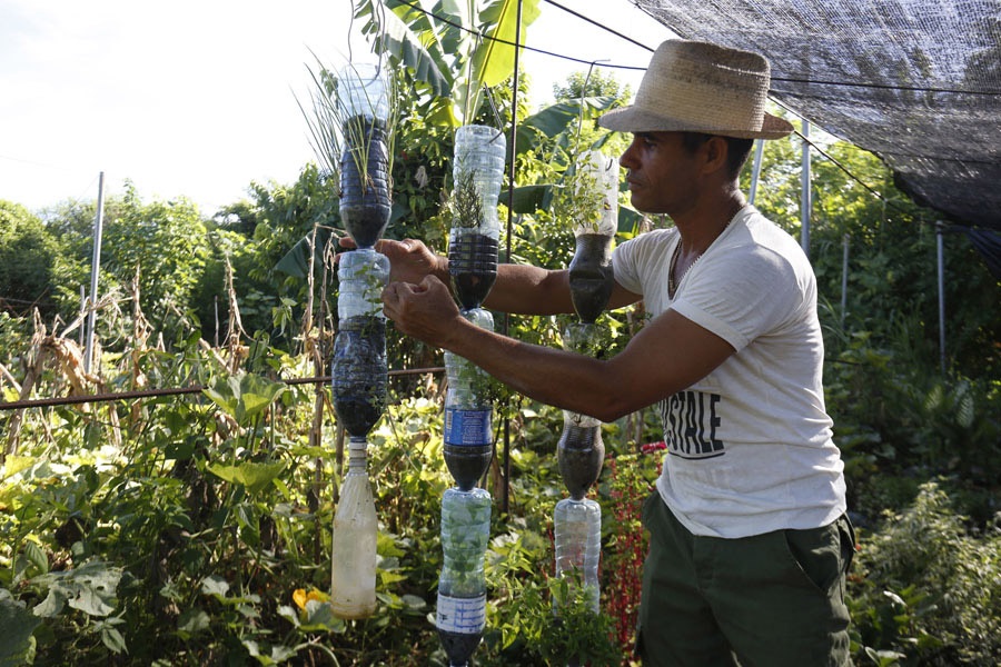 El productor Liuber Ojeda muestra las plantas que cosecha en pomos plásticos desechables en el reparto habanero de Alamar. La economía azul representa una oportunidad de transformar el panorama económico de Cuba, al adoptar modelos innovadores y prácticas sostenibles e inclusivas en la gestión empresarial.Foto: Jorge Luis Baños/ IPS Cuba.
