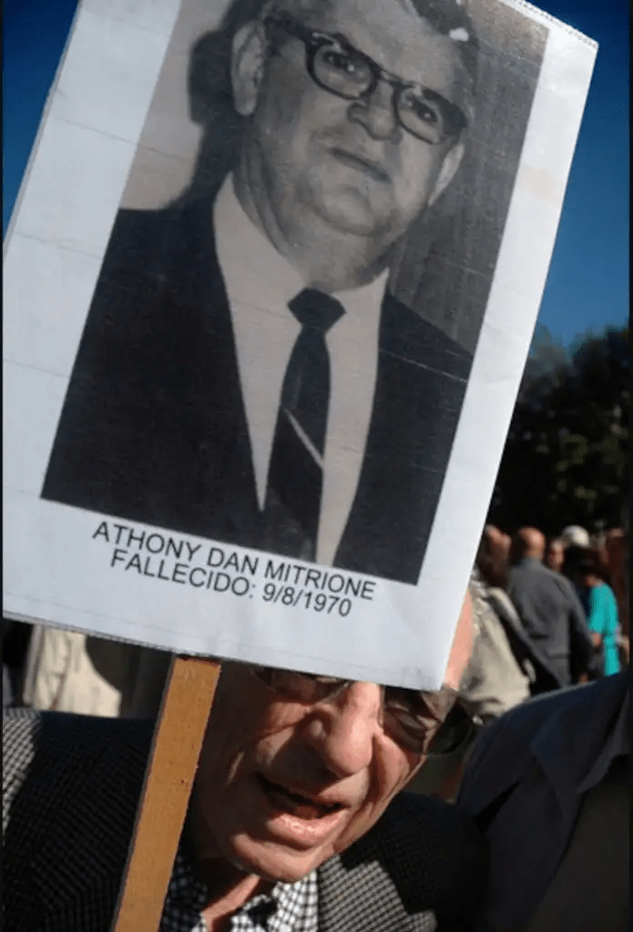 En la pancarta, Dan Mitrione, quien trabajó para la AID enseñando métodos de tortura en países de AL. Foto Afp