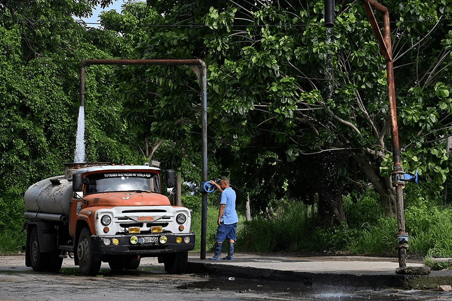 Un trabajador de la empresa Aguas de La Habana supervisa el llenado de un camión cisterna que suministra agua potable a habitantes de comunidades de La Habana. Al comienzo de febrero de 2025, en Cuba más de 600 000 personas recibían el servicio de agua en forma permanente mediante camiones cisternas. Imagen: Jorge Luis Baños / IPS