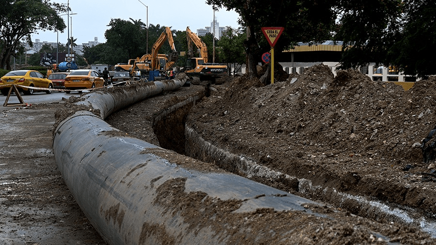 La empresa Aguas de la Habana extiende una tubería de polietileno de alta densidad, dentro de la instalación de nuevas redes hidráulicas, en la capital cubana. En 2024, el gobierno instaló 241 kilómetros de nuevas redes, conductoras y conexiones de abasto de agua, para disminuir los problemas crónicos del suministro del recurso a la población. Imagen: Jorge Luis Baños / IPS