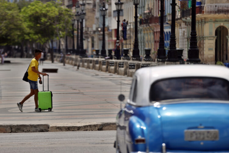 Un hombre con una maleta camina por el paseo del Prado, en La Habana. Foto: Ernesto Mastrascusa/EFE.