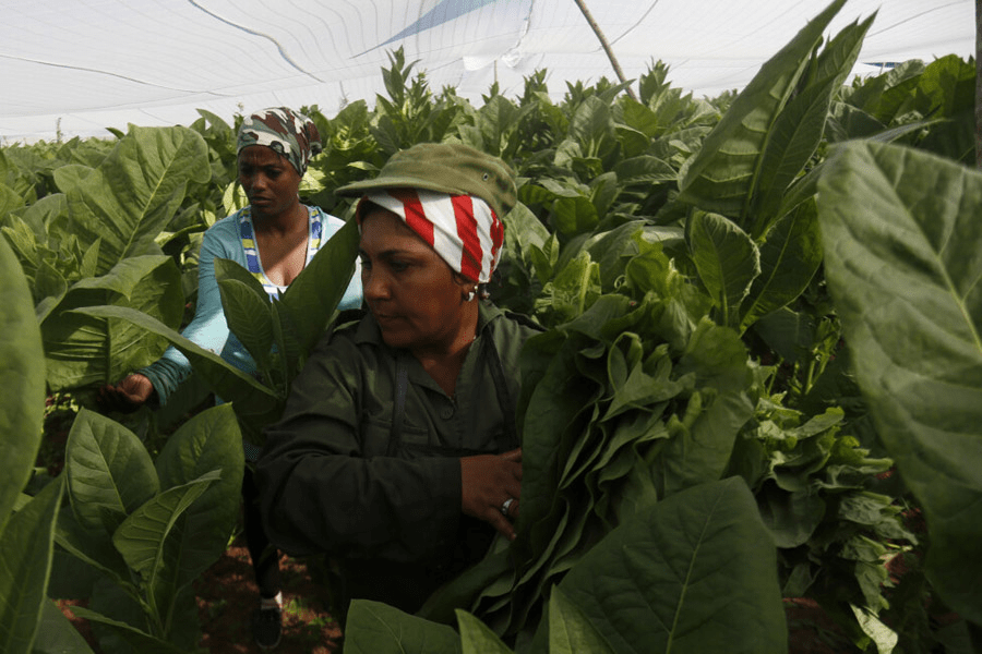 Operarias agrícolas recolectan hojas de tabaco en una finca ubicada en el municipio San Juan y Martínez, en la provincia de Pinar del Rio, en el extremo occidental de Cuba. Si bien las ventas de tabaco por exportación han aumentado, la producción de la hoja no alcanza los índices de años atrás. (Foto: Jorge Luis Baños / IPS Cuba)