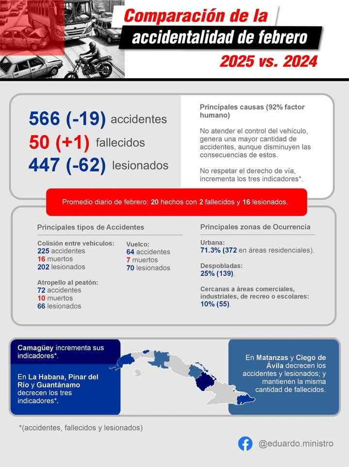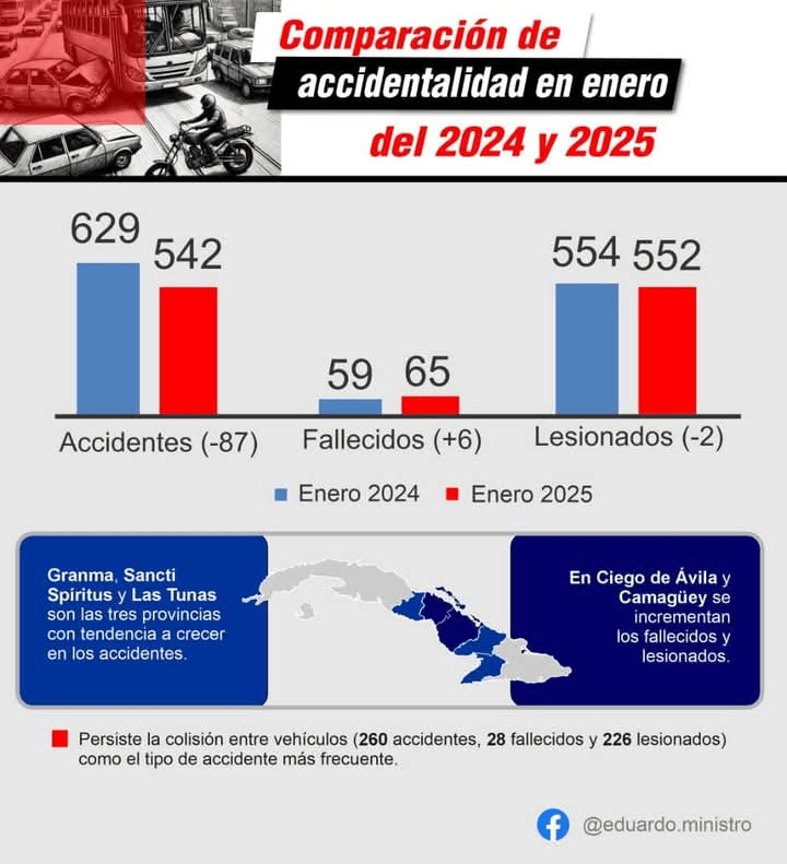 En su página de Facebook, el ministro de Transporte precisó que, al cierre de enero, con respecto a igual mes de 2024, los indicadores de accidentes y lesionados reportan una disminución (-87 accidentes, -2 lesionados); sin embargo, el índice de muertes se incrementó.