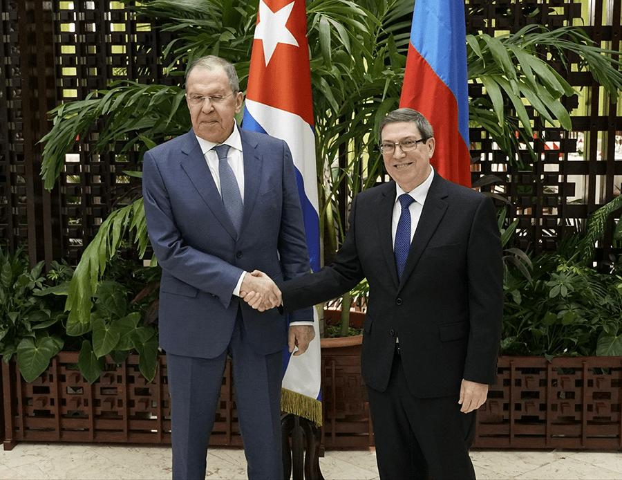 El ministro de Relaciones Exteriores de Rusia, Serguéi Lavrov, estrecha la mano de su homólogo cubano, Bruno Rodríguez, durante su novena visita a Cuba, el 19 de febrero. El jefe de la diplomacia rusa, cuya anterior estancia en la isla fue en abril de 2023, enfatizó que Cuba es un importante aliado de Moscú en América Latina y el Caribe. Foto: POOL