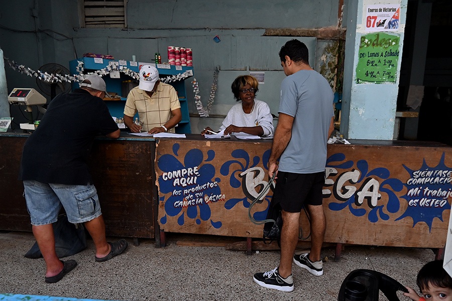 Varios clientes son atendidos por dependientes de una bodega en La Habana, el establecimiento estatal que expende productos racionados a precios subsidiados. Cada vez son menos los alimentos subsidiados que pueden obtenerse a precios asequibles en Cuba.Foto: Jorge Luis Baños/IPS