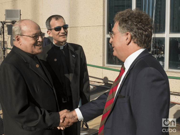 Joe García saluda al Cardenal Jaime Ortega, exarzobispo de La Habana (fallecido en julio de 2019), junto a Yosvany Carvajal, rector del Centro Cultural Padre Félix Varela (y actual párroco de la Catedral de La Habana), durante la apertura de la Embajada de Estados Unidos en La Habana, el 14 de agosto de 2015. Foto: Alain L. Gutiérrez Almeida.