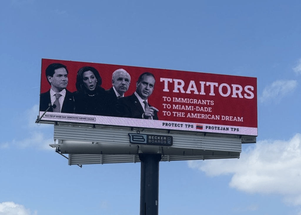 Tanto Giménez como María Elvira Salazar, Mario Díaz-Balart y Marco Rubio han sido descritos como “traidores” en una valla colocada en la autopista Palmetto, entre las ciudades Doral y Hialeah. El Caucus Demócrata Hispano de Miami-Dade que promovió esta campaña dijo que “en lugar de defender a nuestras familias, se han mantenido en silencio mientras las comunidades inmigrantes son atacadas, detenidas y deportadas”.