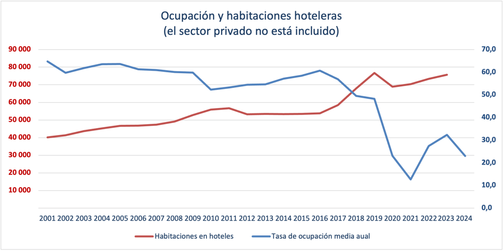 El gráfico que se muestra arriba sintetiza una de las contradicciones mayores que enfrenta hoy el sector: rentabilizar la factura turística con un superávit habitacional que ha ido acumulando capacidades ociosas por más de veinte años y que incluso en los mejores años de arribos de turistas (2015-2018) no logró rebasar nunca el 60 % de ocupación de forma sostenida.