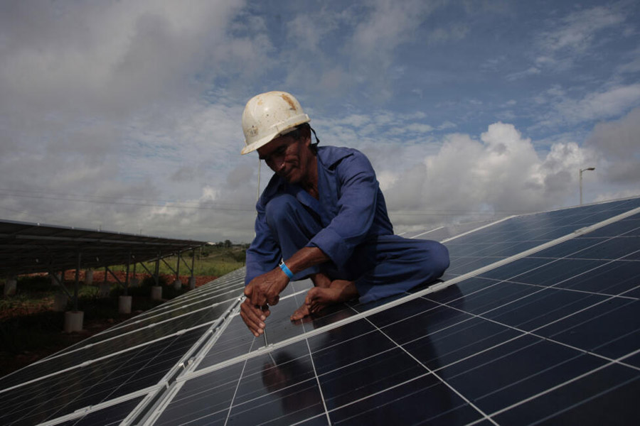 Un trabajador de la estatal empresa eléctrica labora en la instalación de paneles solares en La Habana. Para 2030, Cuba pretende que 24 % de su generación eléctrica proceda de fuentes renovables de energía.Foto: Jorge Luis Baños/ IPS Cuba