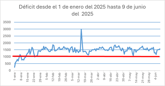 No es nada nuevo que en lo que va del año 2025 con honrosas excepciones el déficit de generación eléctrica ha estado siempre por encima de los 1000 Megawatts lo que marca una situación más que critica, por lo que afecta a la sociedad en general, con provincias y municipios que han tenido más de 20 horas seguidas de apagones diarios.