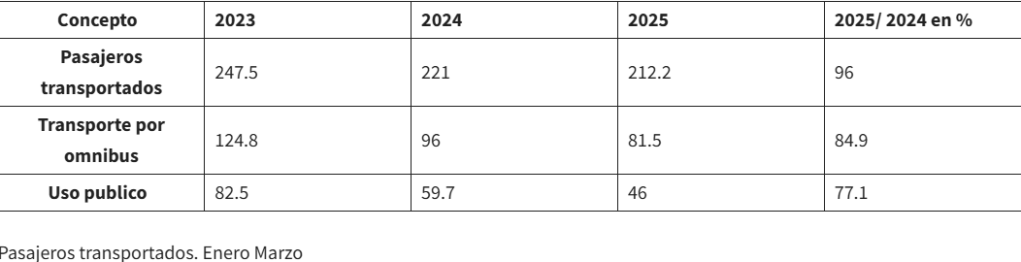 Unos de los temas sensibles para la población, son tanto la alimentación como el transporte, en este último por disimiles motivos, entre los que se encuentra la baja disponibilidad de los medios, tanto por deterioro, como insumos básicos elementales como ómnibus, neumáticos, baterías, etc., ha llevado a una disminución de los pasajeros transportados, que en el caso de los ómnibus es 14 millones menos de pasajeros.