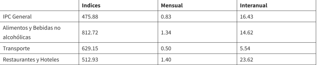 Aunque se mantiene una tendencia a la desaceleración desde 2024, se manifiesta una resistencia a su reducción. La tasa inflacionaria se encuentra en el entorno del 16.43 %. Esto no significa que bajen los precios, sino que siguen creciendo, pero a un ritmo menor. Así en mayo del 2025 el Índice de Precios al consumidor se ubicó en un 475.88 respecto al año base de 2010, con una variación interanual del 16.43 % según tabla siguiente.