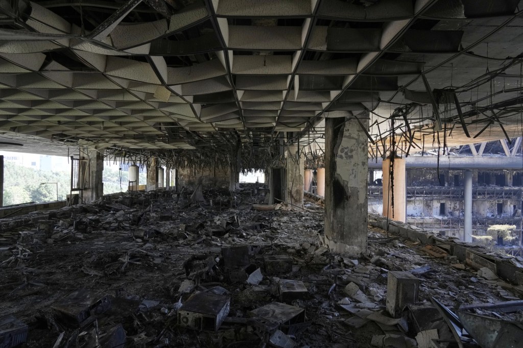 La sede dañada de la televisora estatal iraní se ve en Teherán, Irán, el jueves 19 de junio de 2025. (AP Foto/Vahid Salemi)