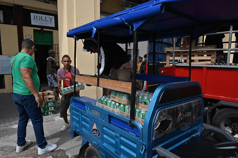 Trabajadores trasladan mercancías en un triciclo eléctrico estacionado en el exterior de una mipyme privada, en La Habana. El sector privado realizó importaciones por 1195 millones de dólares entre enero y junio de 2025, un crecimiento de 34 % con respecto al mismo periodo de 2024