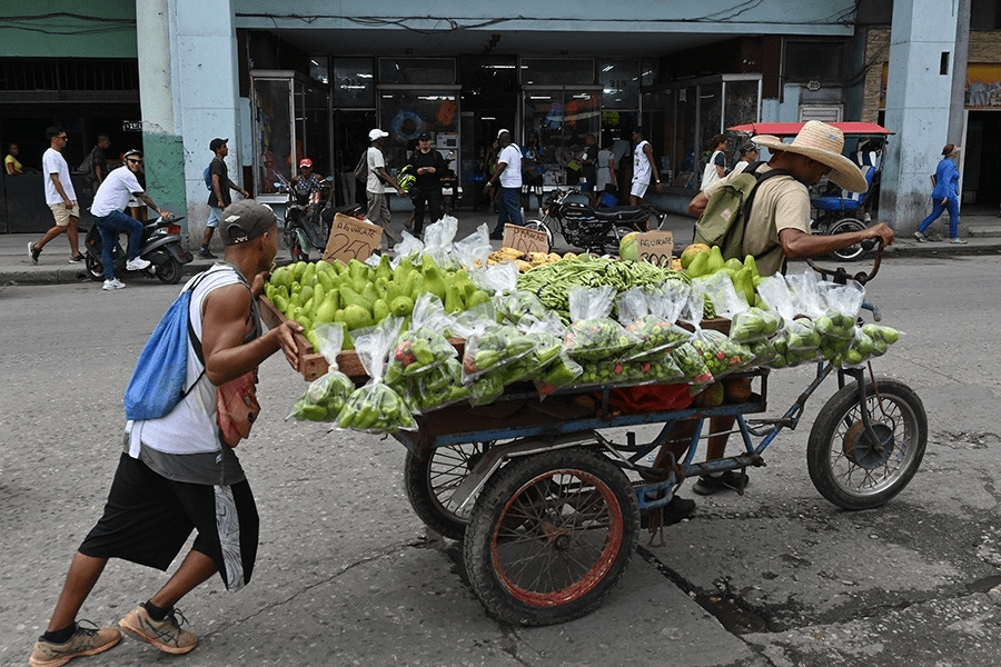 Dos trabajadores autónomos empujan una carretilla usada para comercializar alimentos frescos de manera ambulante, en La Habana. La economía cubana tuvo una contracción del 1,1 % de su producto interno bruto en 2024.