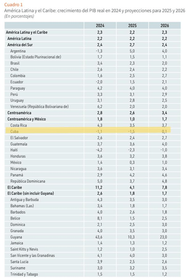 El Estudio Económico de A. Latina y el Caribe de CEPAL divulgado hoy pronostica dos años adicionales de penuria económica para Cuba: recesión con caída de 1,5% en 2025 y estancamiento con ínfimo crecimiento de 0,1% en 2026. Solamente Haití estaría peor.