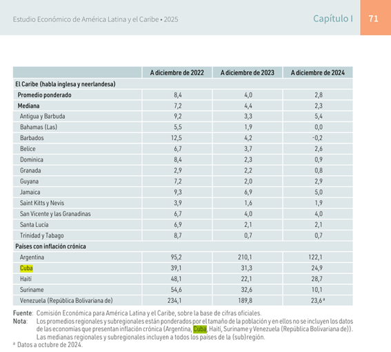 Otro dato interesante del informe de CEPAL es que Cuba aparece clasificada como “país con inflación crónica” (la tercera más alta en 2024), es decir entre los 5 países con datos tan malos que se excluyeron del cálculo de los promedios regionales y subregionales.