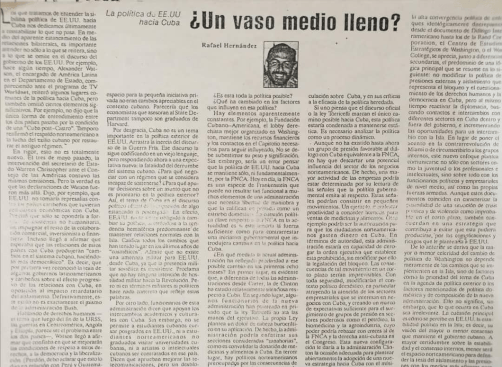 Con la llegada de la Administración Clinton, volví a probar suerte en el NH, esta vez con un texto titulado “La política de EE. UU. hacia Cuba: ¿un vaso medio lleno?”. Ahí interpretaba como favorables algunas señales emitidas por el Departamento de Estado, que además de no machacar con “la Cuba post-Castro” ni el compromiso con el exilio cubano, saludaban las buenas relaciones de los países del Caribe con la isla y su posible influencia en los cambios internos; reconocían que no había una amenaza cubana para EE. UU., y favorecían los intercambios académicos y culturales.