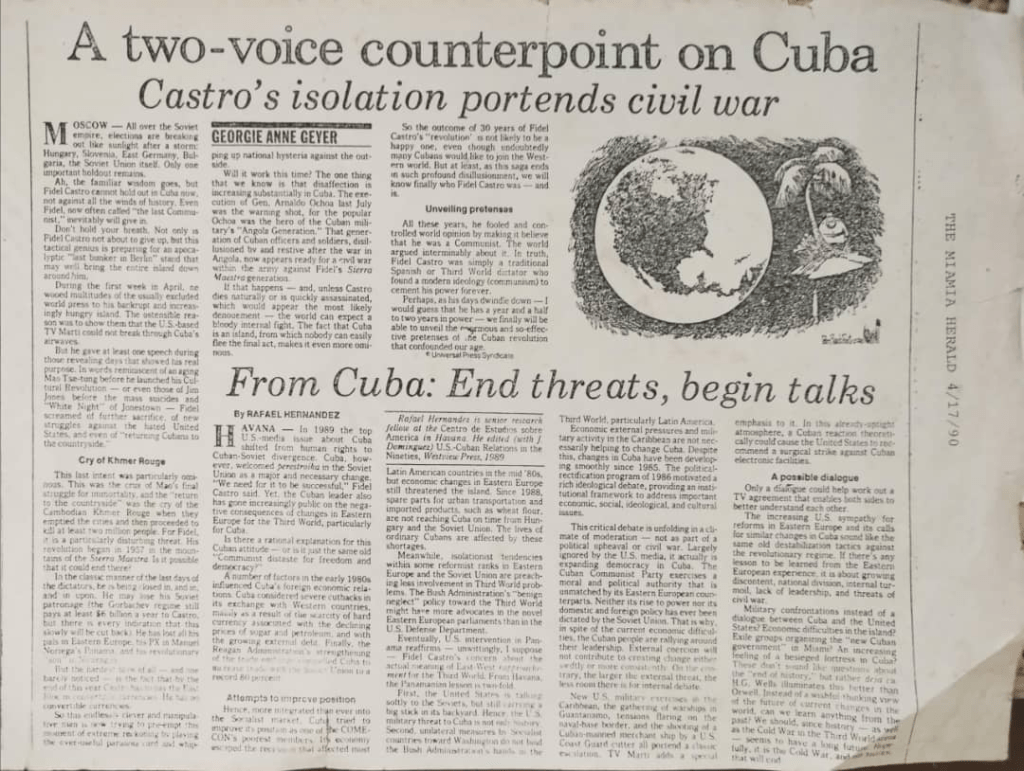 Finalmente lo publicaron (MH, 17 de abril, 1990) escoltado por uno de Georgie Anne Geyer, titulado “El aislamiento de Castro presagia una guerra civil”, en una misma página que decía arriba “A two-voice counterpoint on Cuba”.