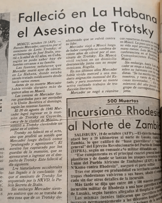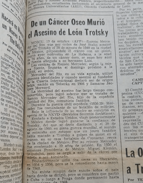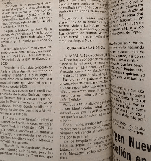 La nota agregó que la prensa cubana omitió el asunto y que en los hospitales públicos de La Habana no hubo registro de “ningún paciente llamado Ramón Mercader”.