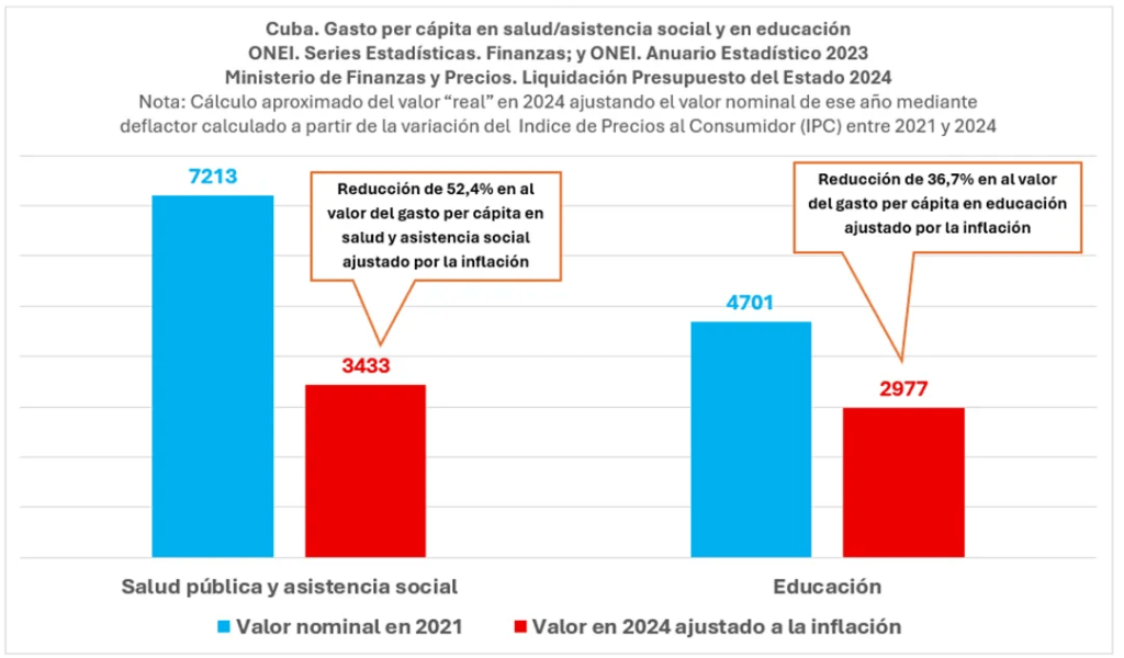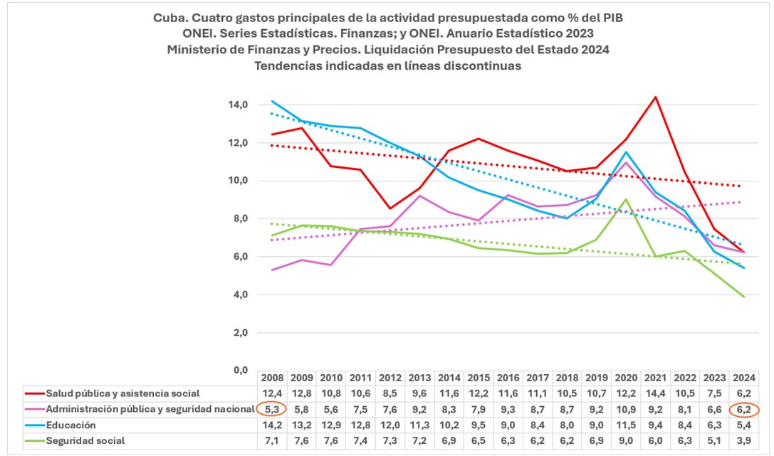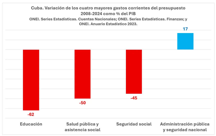 Aunque el peso relativo combinado de salud, educación y seguridad social mantenía 35 años después el mismo por ciento en la estructura de los gastos corrientes (48,2% en 2008 comparado con 48,7% en 2024), el por ciento que representa en el PIB se ha desfondado con el fracasado programa del “ordenamiento” lanzado en 2021.