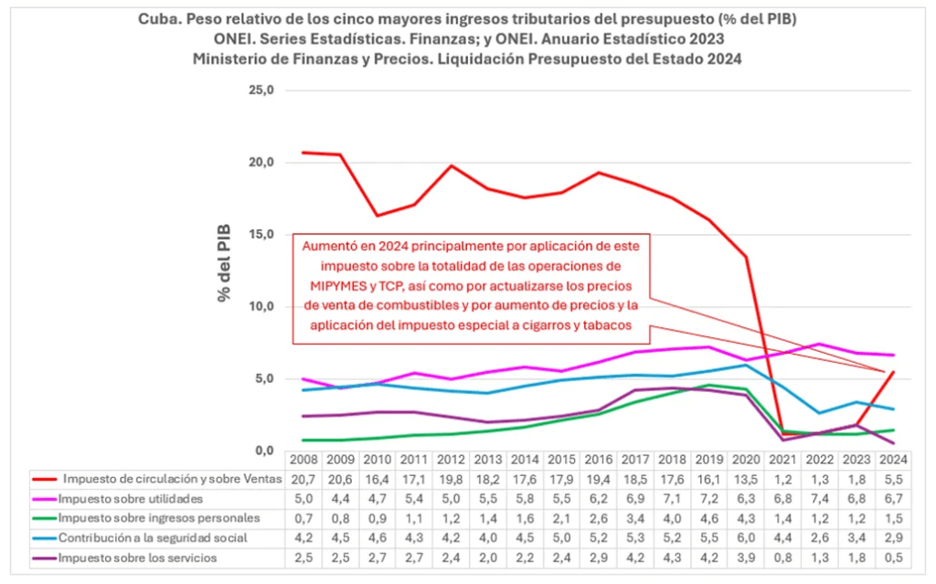 El impuesto de circulación y sobre ventas registró un salto en 2024 que oficialmente se ha explicado por la aplicación del impuesto sobre la totalidad de las operaciones de MIPYMES y Trabajo por Cuenta Propia (TCP), así como por aumento de los precios de combustibles y productos del tabaco, y el impuesto especial a estos últimos.