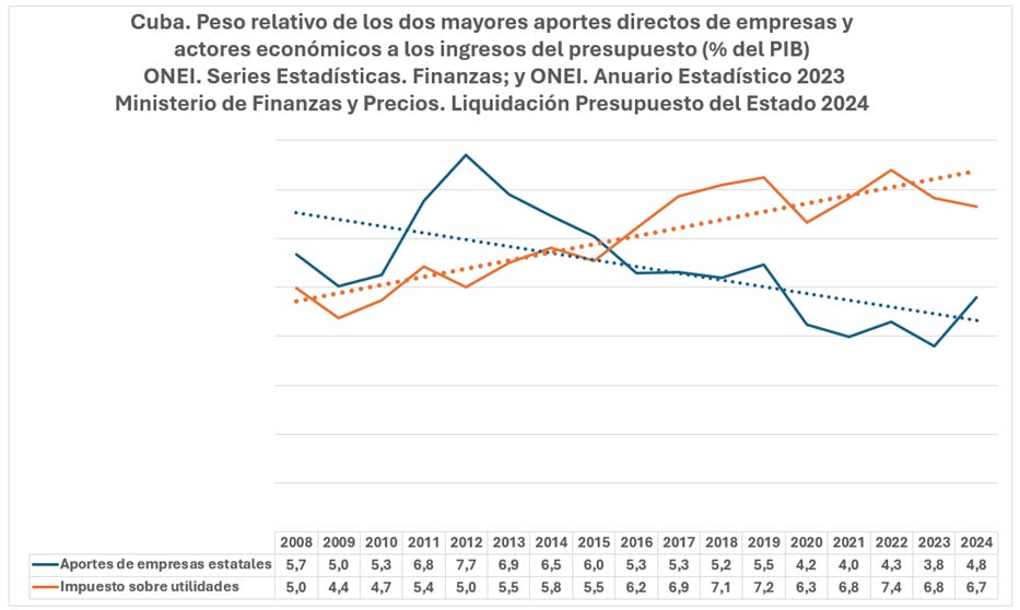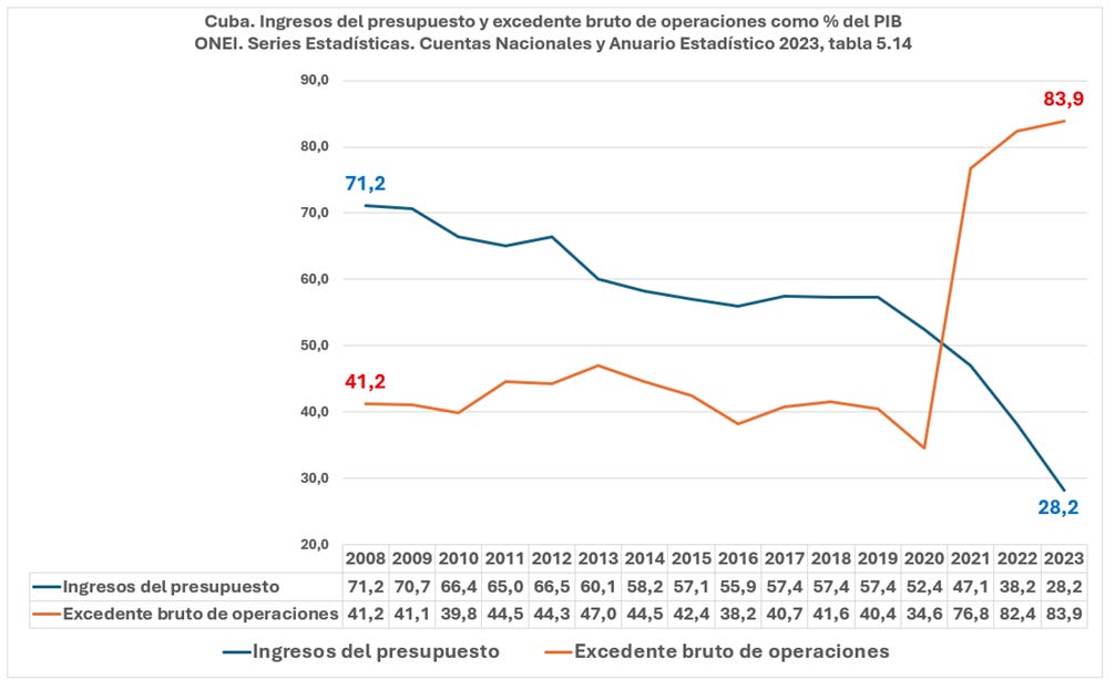 Las empresas y actores captan un creciente por ciento del PIB a la vez que las arcas estatales captan ingresos cada vez menores como por ciento del PIB. Con el “ordenamiento”, empresas y actores “aligeraron” su responsabilidad fiscal y eso subvirtió el espacio fiscal del Estado cubano.