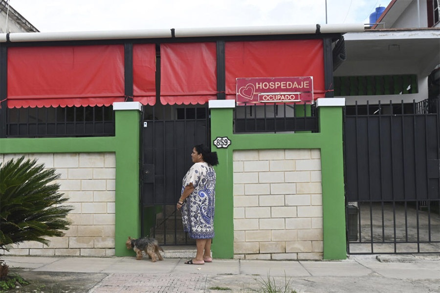 Una mujer junto a su mascota en la entrada de una vivienda que presta servicios de hospedaje, en La Habana. Los precios del alquiler de viviendas en Cuba se han vuelto inaccesibles para la mayoría de la población de la isla.Foto: Jorge Luis Baños / IPS