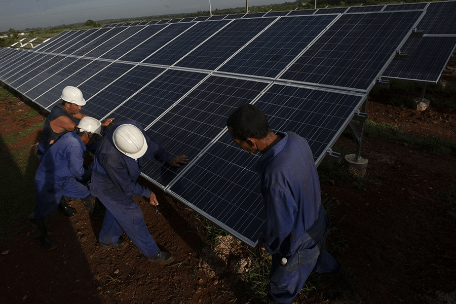 Trabajadores de la empresa eléctrica de Cuba laboran en la instalación de paneles solares, en La Habana. El gobierno ha apostado por acelerar la transición energética con la instalación de parques fotovoltaicos en múltiples territorios del país.