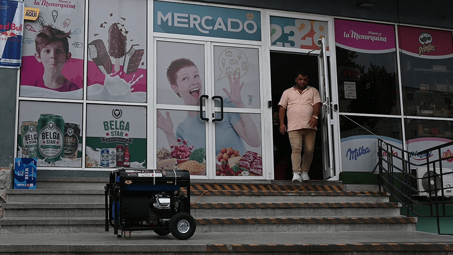 Un generador eléctrico funciona en el exterior de un mercado privado en La Habana mientras un cliente sale del establecimiento durante el corte eléctrico general, ocurrido el 10 de septiembre de 2025. El último largo apagón nacional es el quinto de su tipo en menos de un año.