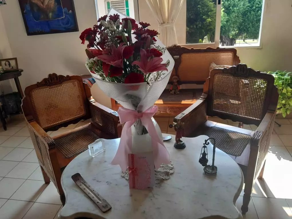 Le llaman al móvil y le piden que baje a las puertas del edificio para una entrega. Como que nadie le ha puesto sobre aviso, duda, piensa que se trata de una estafa o un robo. La joven que le habla, le ruega que descienda, que se trata de una sorpresa. Y ahí estaba un ramo de flores de esos que llaman de primer nivel remitido por su hija Lorena, residente en el exterior.