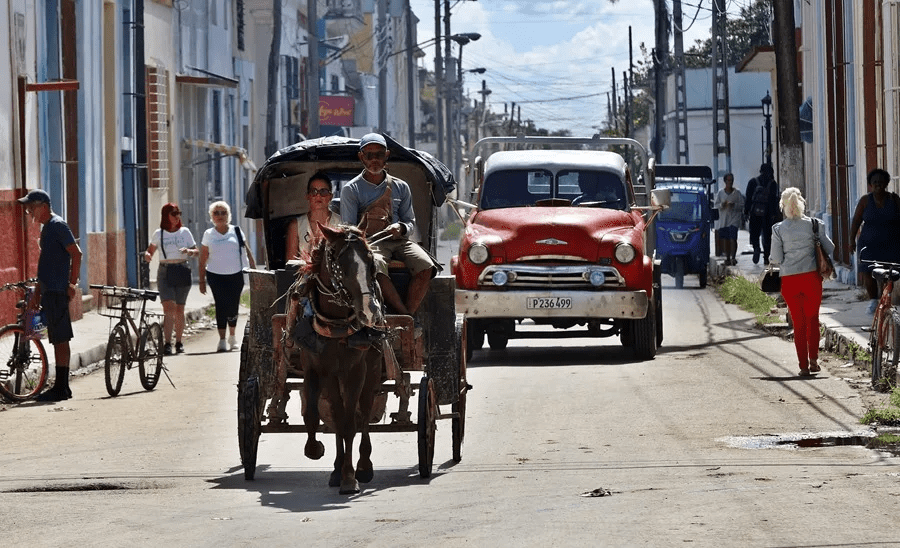 Personas se transportan en una carreta, en Cárdenas (Cuba). EFE/ Ernesto Mastrascusa