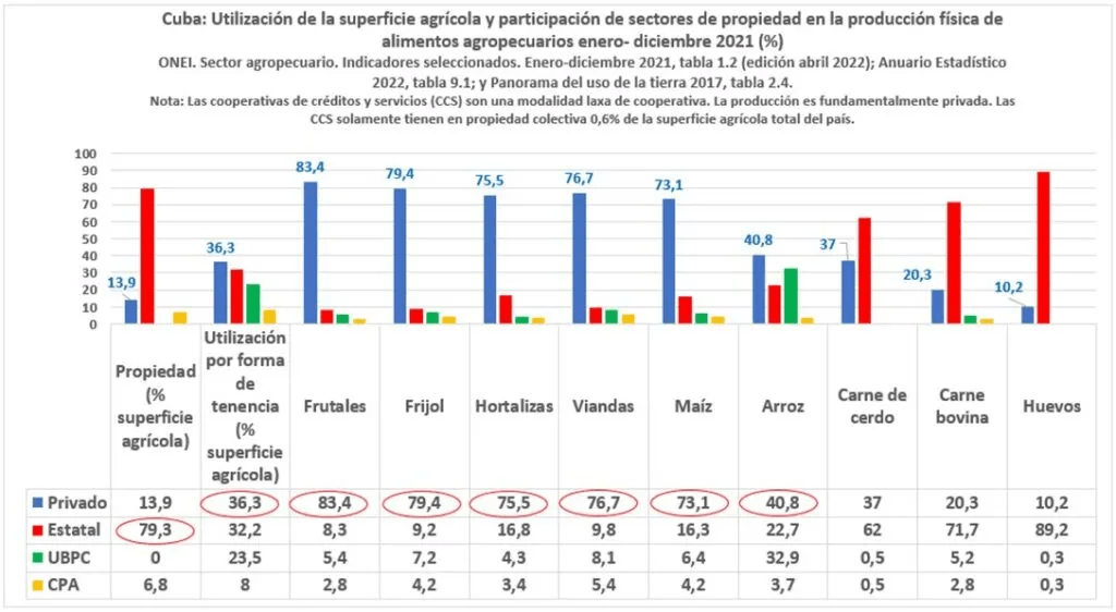 Los datos oficiales lo confirman: aunque el sector estatal controla cerca del 80 % de la superficie agrícola, los productores privados —con apenas un 14 % de la tierra en propiedad— generan más del 70 % de las viandas, hortalizas y frijoles. Con menos recursos, producen más. El problema no es la tierra, sino el marco institucional que define cómo puede usarse.