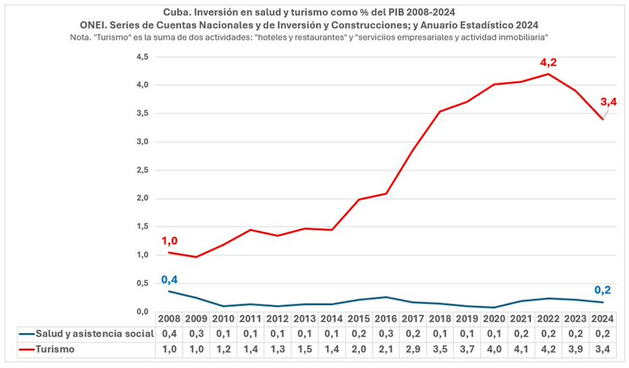 En 2008 la inversión turística era 2,5 veces mayor que la inversión en salud como % del PIB, pero en 2024 la diferencia aumentó a 17 veces. El “esfuerzo” nacional en salud en 2024,medido por el % del PIB, era la mitad del registrado en 2008.