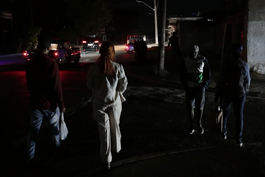 Personas transitan por una calle a oscuras durante uno de los cada vez más frecuentes apagones en La Habana. Actualmente, la generación de electricidad no llega a cubrir la mitad de la demanda cubana.