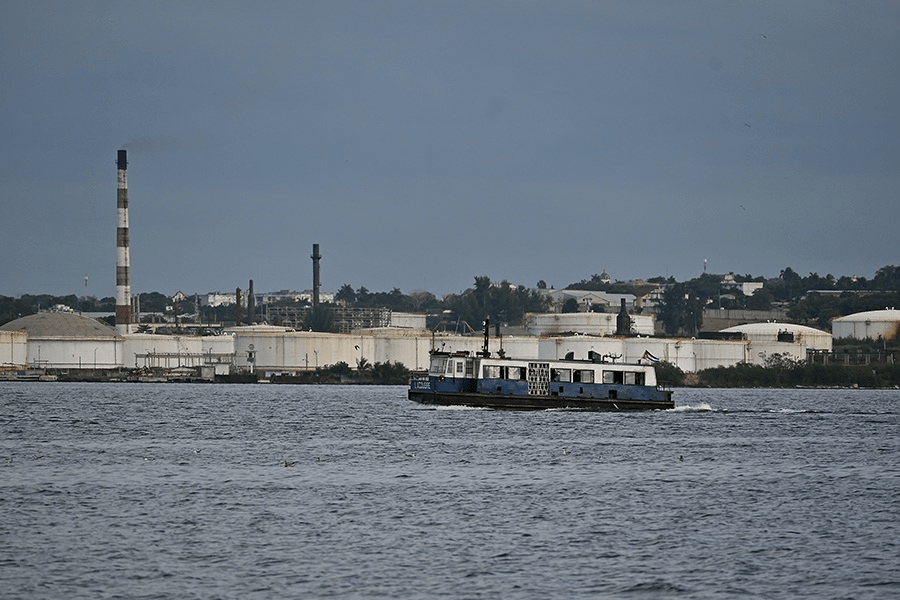 Una embarcación empleada en el transporte de pasajeros navega por las inmediaciones de la refinería petrolera Ñico López, en las adyacencias de La Habana. Cuba solo extrae aproximadamente 40 % del crudo que necesita, mientras el resto le llega del exterior, algo que Estados Unidos pretende bloquear ahora