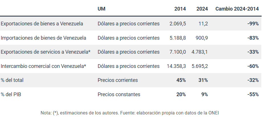 La reducción o desaparición del intercambio con Venezuela implicaría efectos similares a los observados en los años 90, pero amplificados por la fragilidad acumulada y por el cerco energético. Se produciría una caída adicional del PIB, mayores disrupciones en la balanza de pagos, contracciones en exportaciones e importaciones, y un deterioro del balance fiscal, cuyo déficit volvería a ampliarse tras cierta reducción reciente. Todo ello tendría un efecto devastador en el consumo de los hogares, agravando los niveles actuales de pobreza y escasez.