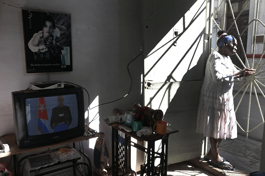 Una mujer residente en la Habana mira por la puerta enrejada de su vivienda mientras escucha la transmisión de la alocución del presidente cubano Miguel-Díaz Canel, el 5 de febrero, en televisión nacional.