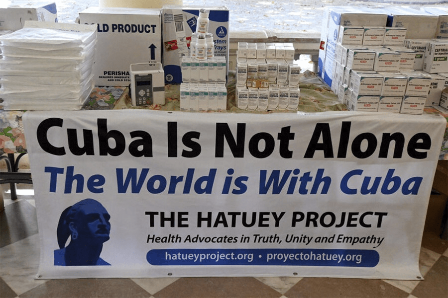 “Cuba no está sola”, reza una pancarta en inglés que acompaña donativos de medicamentos destinados a niños con cáncer en Cuba, gestionados por el estadounidense Proyecto Hatuey, en La Habana. Varios países han anunciado envíos de ayuda humanitaria a Cuba, tras el bloqueo de combustible impuesto por Estados Unidos. (Foto: Jorge Luis Baños/IPS)