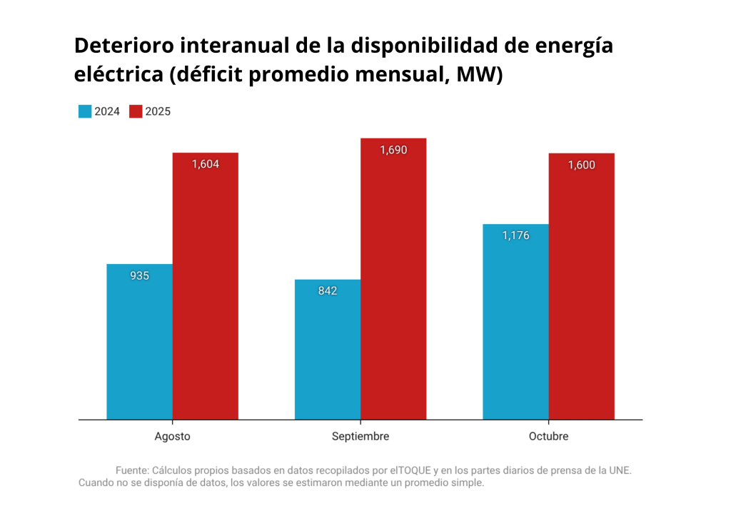 - Crisis estructural del sector energético: La generación de electricidad cayó de más de 21 000 GWh en 2019 a menos de 16 000 GWh en 2025, una disminución de casi el 25 %. Los déficits de generación han aumentado drásticamente y, en ocasiones, se aproximan a un tercio de la capacidad disponible del sistema.