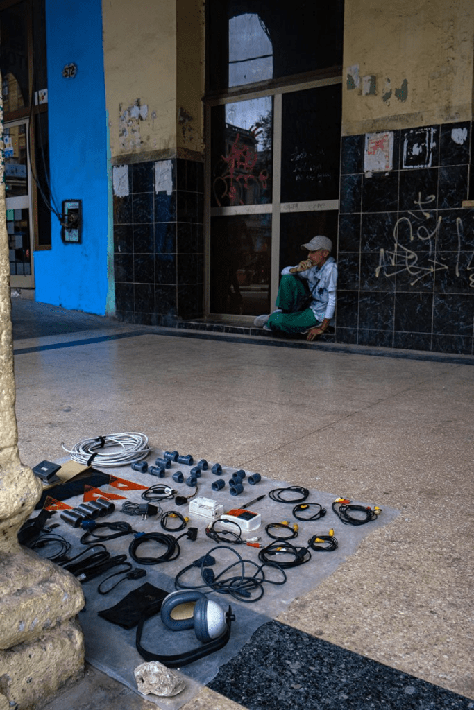 “Aunque algunos productos estén algo deteriorados, todos funcionan y los vendo a un precio mucho más bajo que cualquier tienda”, dice mientras señala sus mercancías: cables eléctricos, electrodomésticos, micrófonos, piezas de repuesto para fines diversos y ropas de uso.