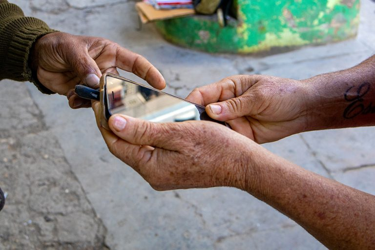 Probando una funda para celular, usada. Foto: Enrique González (Enro)/ Cubadebate.