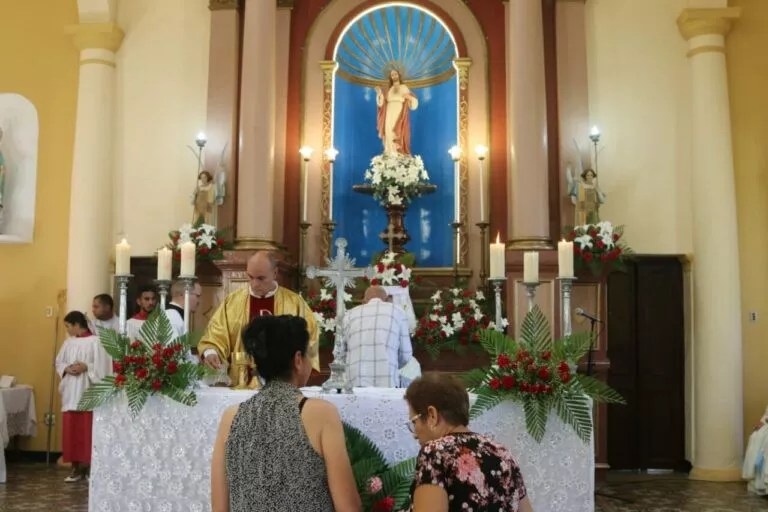 Celebración de Domingo de Resurrección en una iglesia cubana con decoraciones florales. Foto: Yuri Brizuela